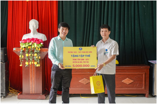 Ngày 16 tháng 10 năm 2024, trường THCS – THPT Phan Bội Châu cùng Đoàn công tác thiện nguyện Hệ thống Giáo dục Đại Việt thăm, khám bệnh và tặng quà đến đồng bào miền Bắc đã dừng chân tại Trung tâm GDNN – GDTX huyện Hạ Hòa, thị trấn Hạ Hòa, tỉnh Phú Thọ. Tại đây, đại diện trường THCS – THPT Phan Bội Châu đã trao tặng 20 suất học bổng, mỗi suất trị giá 1 triệu đồng cho các em học viên có hoàn cảnh khó khăn, đồng thời nhà trường cũng trao tặng đến tập thể cán bộ, giáo viên nhân viên của trung tâm 5 triệu đồng.